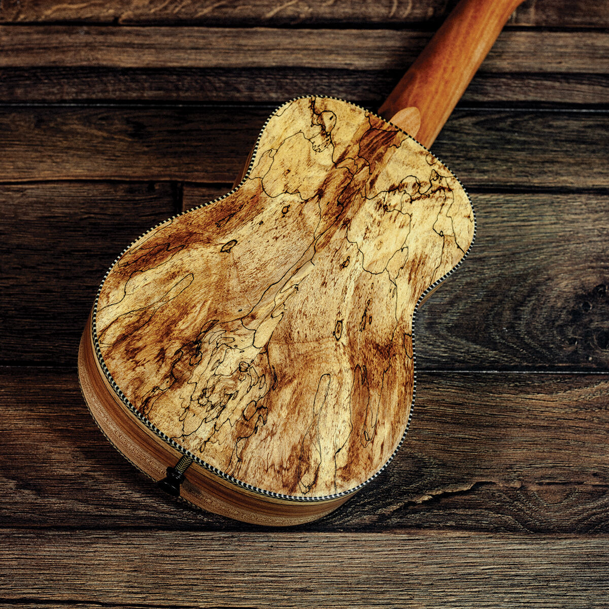 BMUK9 ukuleles are made from Spalted Maple tonewoods. This visually beautiful and distinctive tonewood has light peach colouring interspersed with darkly feathered grain textures. Each instrument will be truly personal to you as each piece of tonewood will be endowed with its own unique pattern.