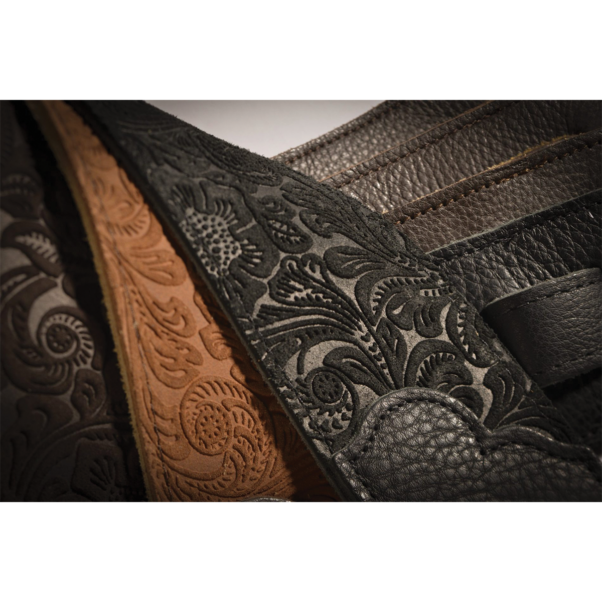 The richly embossed suede and the plush, softly pebbled glove leather end tab offer a beautiful blend of complimentary textures. The pattern in the suede seems inspired by the exquisite fingerboard inlay work of our industries most accomplished artisans.