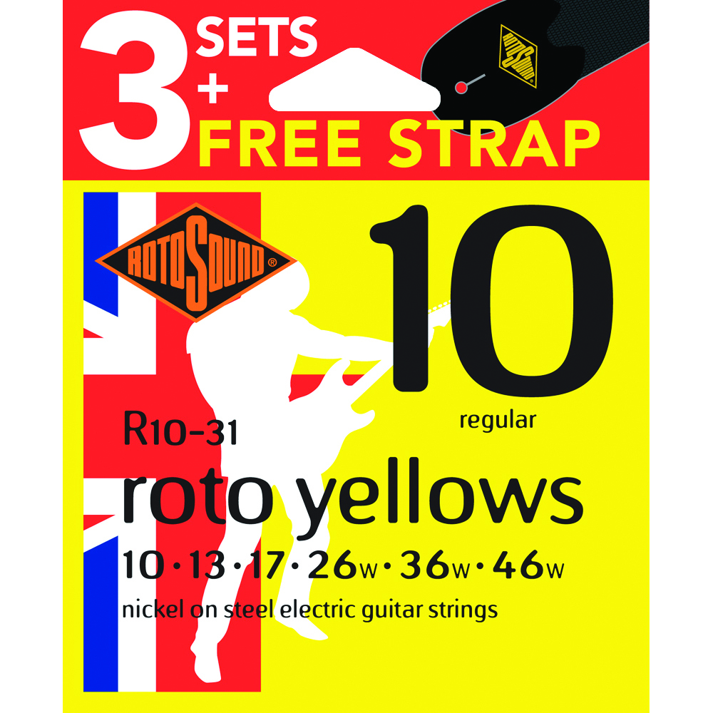 Rotosound Roto Yellows Electric Value 3-Pack String Set + Bonus Strap [R1031]