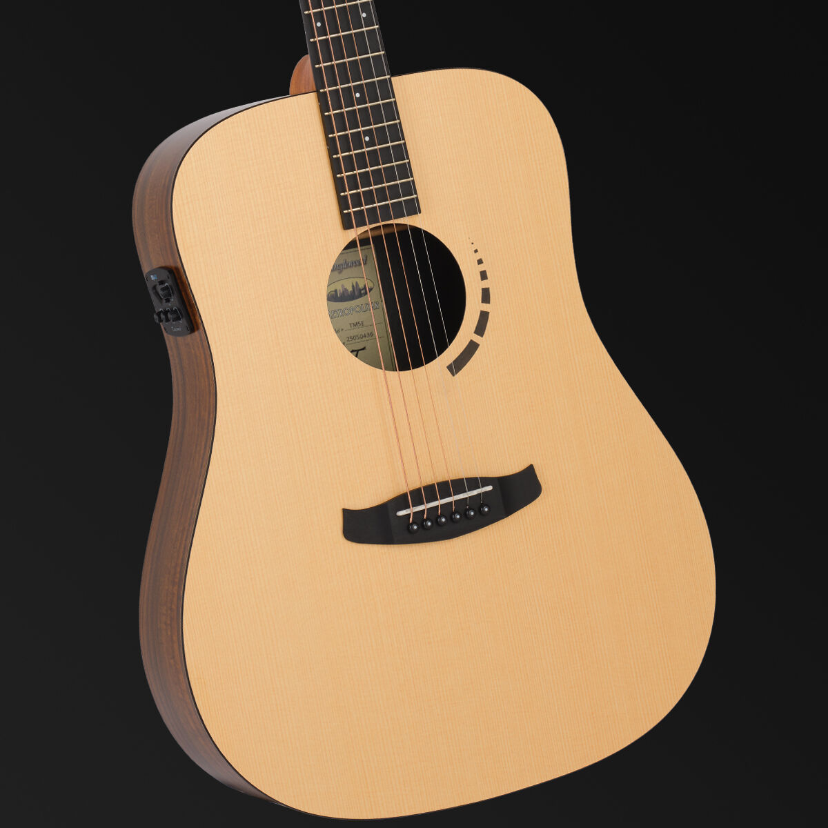 At the heart of the TM5E is a spruce top, chosen for its lively, responsive tone and excellent dynamic range. The back and sides are made from koa, a wood known for its warmth, balanced overtones, and striking grain patterns. Using high pressure laminate (HPL) construction for the top, back, and sides adds durability and stability, ensuring the guitar maintains its sound and structure even through changes in temperature and humidity.
